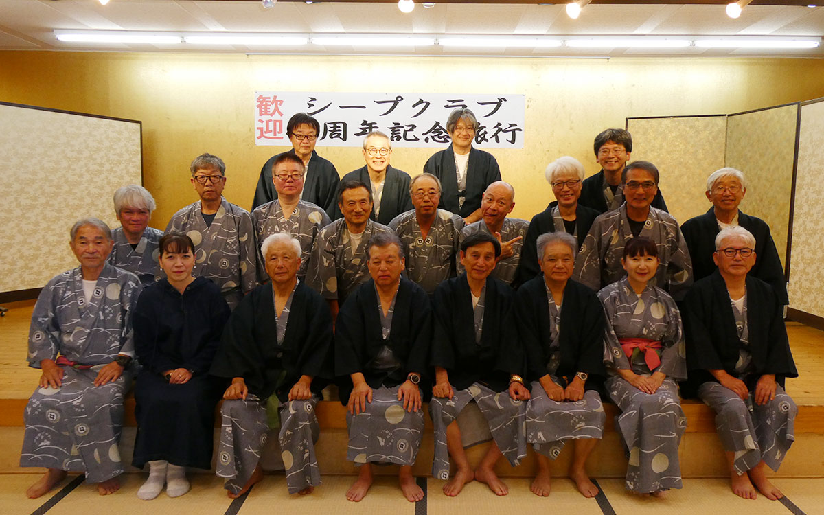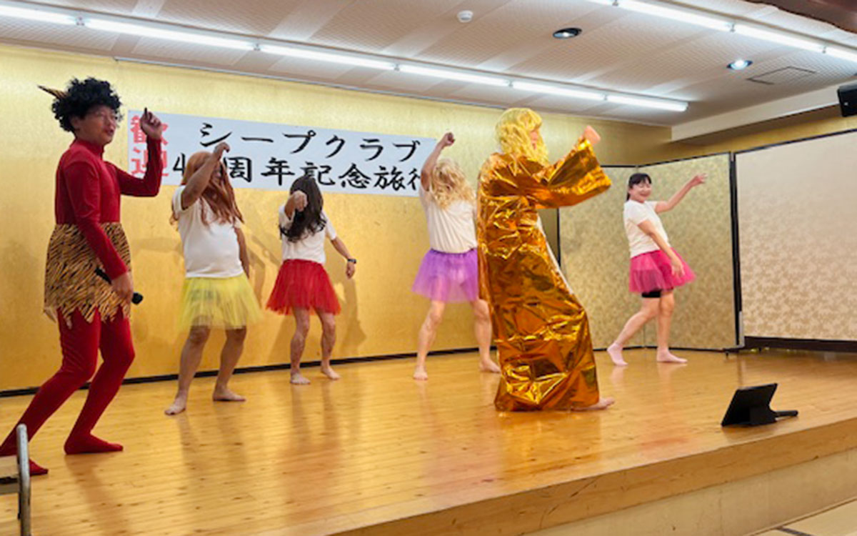 いよいよ乾杯!平倉会長の高らかな乾杯の音頭で宴会へと突入!シープクラブ特有の底抜けに明るく、先輩後輩の区別のない皆でワイワイガヤガヤ、美味しい料理とお酒に囲まれいつも以上に賑やかな宴となりました。後半では、45周年実行委員会のダンサーメンバーによる「どうにもとまらない」と「マツケンサンバⅡ」で女装姿のメンバーに「誰?わからない」の声が上がるほど美しく可愛い?ダンサーたちでした。